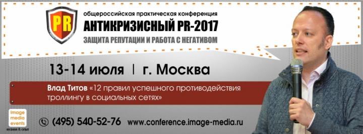 руководитель Лаборатории Коммьюнити Влад Титов на общероссийской специализированной тематической конференции «АНТИКРИЗИСНЫЙ PR-2017: защита репутации и работа с негативом», которая состоится в Москве 13-14 июля.